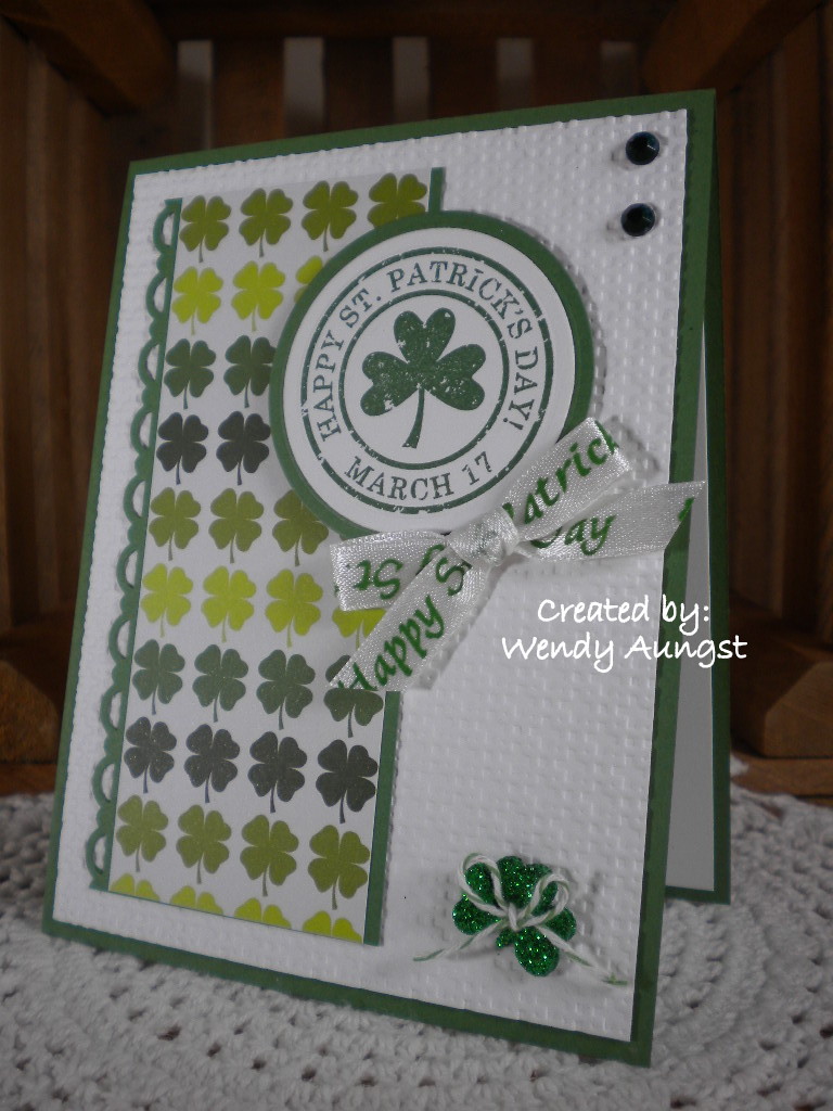 Accessories: Circle Nestibilities, SU Scallop Trim Border Punch, SU Square Lattice Embossing Folder, Rhinestones, Ribbon and Glittery Shamrock Button all from Micheal's, MS Green Twine, Dimensionals, Scor Tape