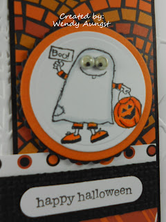 I used Pumpkin Pie as my card base then added a piece of white that I used the Spider Web EF on. I used some old dsp called Creepy Crawly. My main image is from a retired set called Booglie Eyes. I colored my image with Copic Markers and added some googlie eyes to my little ghost. The black cardstock under the main image was embossed with the Square Lattice EF and I punched out the sentiment from Teeny Tiny Wishes with the Word Window Punch and called it done!